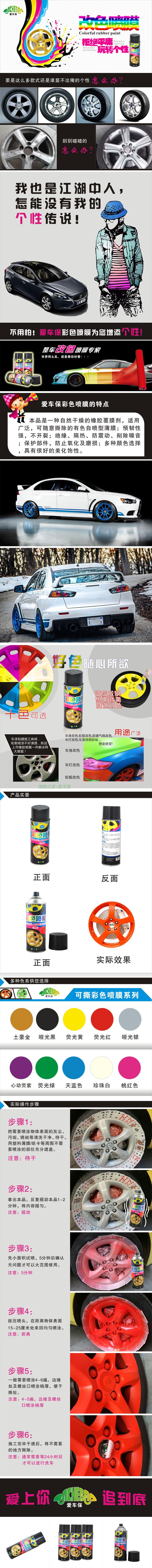 本品使用广泛,适用于汽车轮毂,车漆、进气格 栅、内外饰件、摩托车、自行车的金属构件和烤 漆表面改色,亦适用于木材、玻璃、塑料、橡胶、 混泥土、布料、皮制品、陶瓷等需要改色的表面 上。